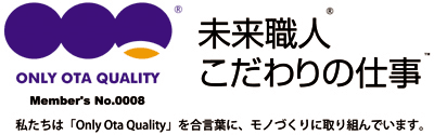 地域貢献: 大田区の地場ブランドの育成 右のマークは2006年2月にスタートした大田ブランドのマーク。大田区の工業集積の強みやモノづくりに対する真摯な職人気質を継承し、未来に挑戦する企業活動の証です。 区内企業5社の推薦を受け、認定企業となることが出来ます。 No.0008は栄商金属の認証番号。このナンバーの付いた商品や サービスを、安心してご利用ください。